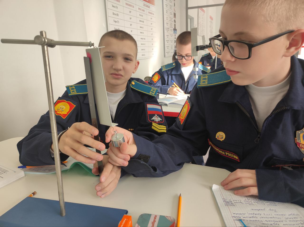 Перед началом занятий Наталья Муратова напомнила кадетам основные положения закона Гука. Далее преподаватель предложила проверить справедливость этой формулы экспериментально.