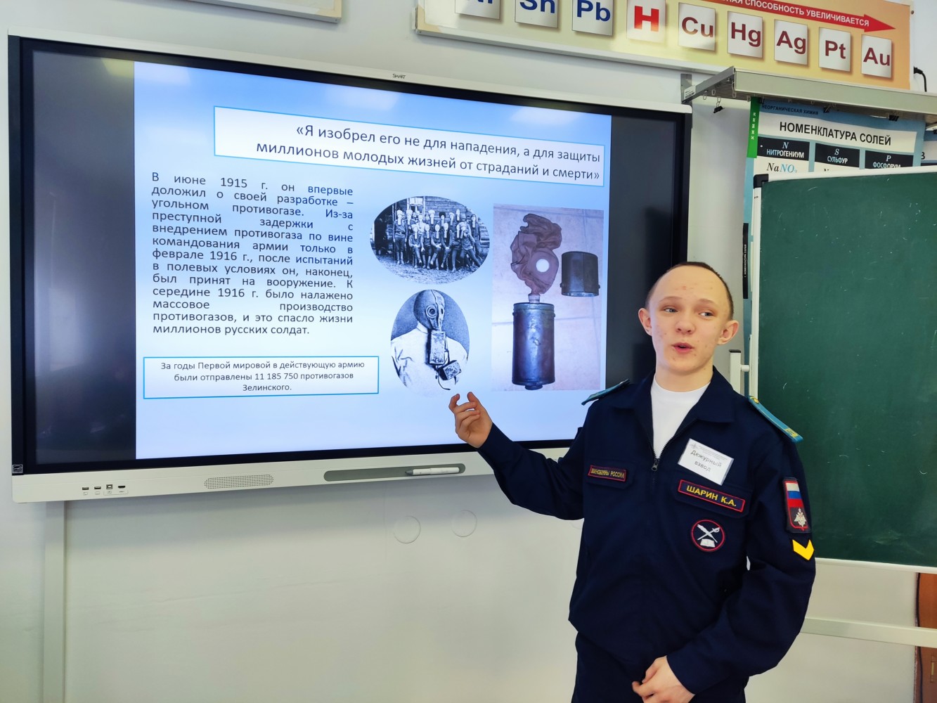 Особенно трогательный момент урока — рассказ о российском химике Николае Дмитриевиче Зелинском, чьё изобретение противогаза спасло тысячи жизней в годы Первой мировой войны. Кадет Шарин Кирилл подготовил сообщение, продемонстрировав первый противогаз и исследования великого учёного. Эта история заставила кадет задуматься о роли науки в защите Родины и ценности человеческой жизни!